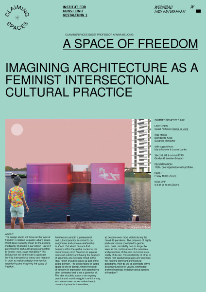 This Master Design Studio takes place in the context of the first Claiming*Spaces guest professorship. The Guest professorship is hosted this year at the Institute of Art and Design. In the summer semester 2021 Guestprofessor Afaina De Jong will offer the design studio "A SPACE OF FREEDOM" in collaboration with Inge Manka (Institute of Art and Design 1), Bernadette Krejs (Researchunit Housing and Design) and Susanne Mariacher.