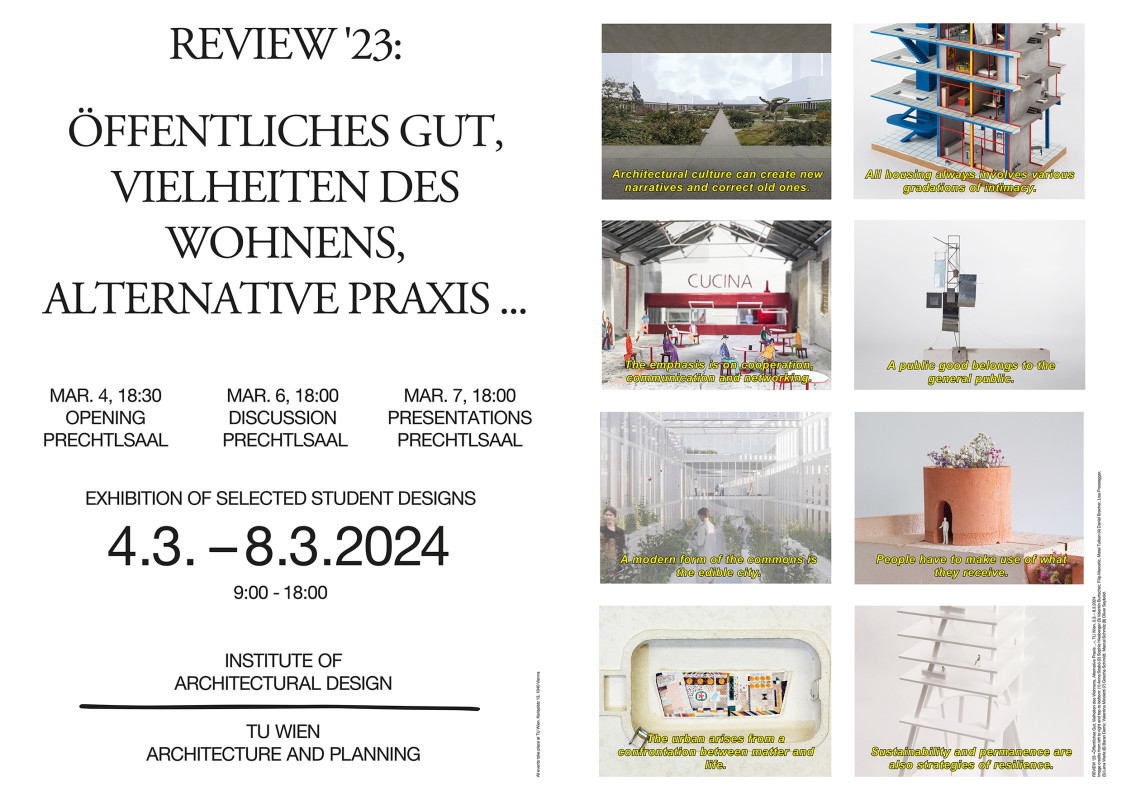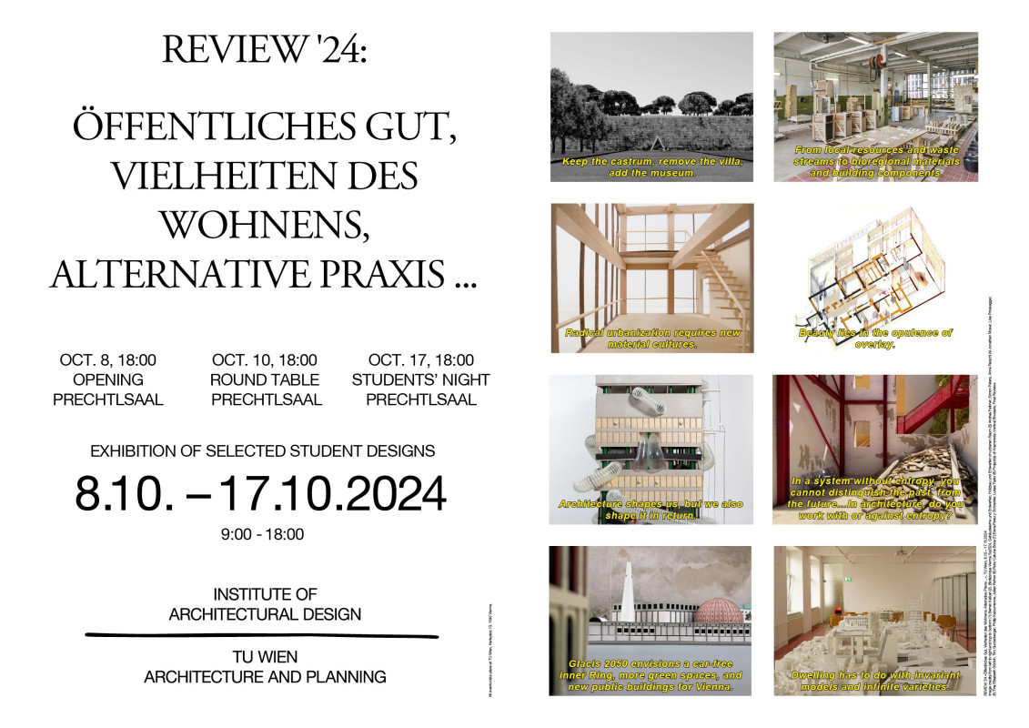 REVIEW’24, die Jahresausstellung des Instituts für Architektur und Entwerfen zeigt ein breites Panorama des forschungsgeleiteten Entwerfens, welches als wichtiges Experimentierfeld für die Entwicklung inhaltlicher und gestalterischer Positionen verstanden wird. Die Ausstellung gliedert sich in 6 Themenbereiche, deren Bandbreite die Diversität des Instituts abbildet: Werkzeuge des Urbanen, Baukultur und kollektive Narrative, Öffentliches Gut, Vielheiten des Wohnens, Alternative Praxis, sowie Resiliente Strukturen. Die gezeigten Arbeiten der Studierenden verstehen sich damit auch als Antworten auf die aktuellen Fragestellungen eines übergeordneten gesellschaftlichen Diskurses und verdeutlichen die Potentiale des kollaborativen und interdisziplinären Kontextes an der Technischen Universität für die praxisnahe Ausbildung von Studierenden.